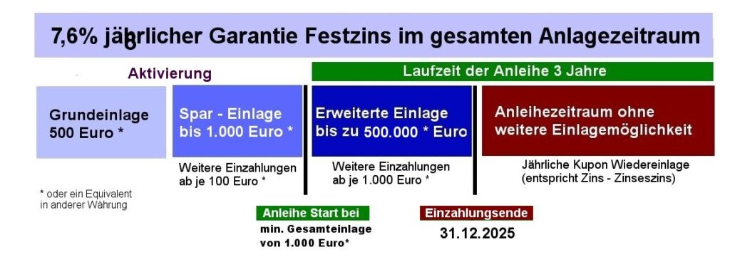 Damit die Anleihe spätestens ab 31. Dezember 2025 wie vorgesehen in den 3 jährigen Anleihezeitraum (Topverzinsung 7,6 Prozent pro Jahr) starten kann, ist ein Mindestbetrag von 1.000 Euro erforderlich.