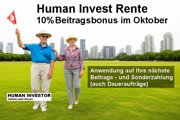 Der Bonus von 10 % wird ausschließlich für Einzahlungen angewendet, die im Aktionszeitraum Oktober 2025 auf Ihrem Rentenkonto eingehen. Dieses Angebot ist gültig für die ersten 1.000 Einzahler. Berücksichtigt werden alle manuellen Beitragszahlungen, Sondereinzahlungen, sowie Daueraufträge. Ebenso interne Überweisungen von einem Human Invest Hauptkonto. Wir informieren wenn das Kontingent erfüllt, und damit die Aktion endet. Sichern Sie sich diese einmalige Chance auf eine signifikante Kapitalstärkung!